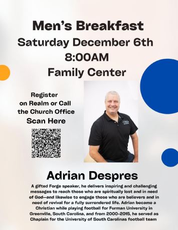 Our prayer is that you will come to as many of our planned events, meet new faces, get to know each other and consider getting plugged in to a small group of men. We will provide names of leaders with various times and dates they meet that hopefully will fit with your schedule.